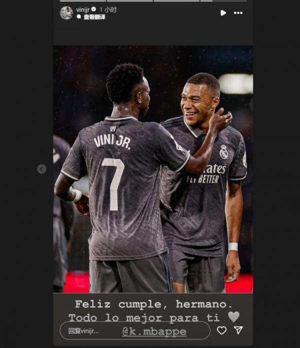 維尼修斯曬出兩人合照,并配文:“生日快樂(lè),兄弟。祝你一切順利@姆巴佩”。