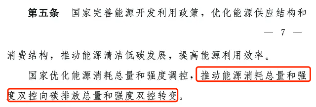 第五條:國家完善能源開發(fā)利用政策,優(yōu)化能源供應(yīng)結(jié)構(gòu)和消費(fèi)結(jié)構(gòu),推動能源清潔低碳發(fā)展,提高能源利用效率。國家優(yōu)化能源消耗總量和強(qiáng)度調(diào)控,推動能源消耗總量和強(qiáng)度雙控向碳排放總量和強(qiáng)度雙控轉(zhuǎn)變。