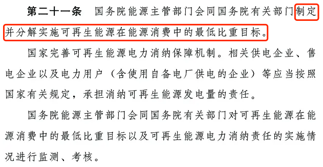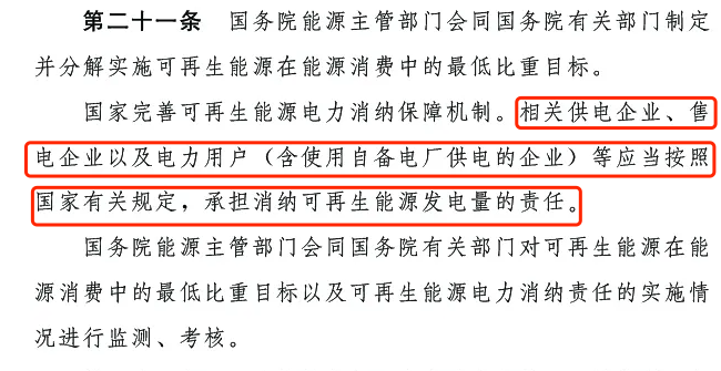第二十一條:國家完善可再生能源電力消納保障機(jī)制。相關(guān)供電企業(yè)、售電企業(yè)以及電力用戶 (含使用自備電廠供電的企業(yè))等應(yīng)當(dāng)按照國家有關(guān)規(guī)定,承擔(dān)消納可再生能源發(fā)電量的責(zé)任。國務(wù)院能源主管部門會同國務(wù)院有關(guān)部門對可再生能源在能源消費(fèi)中的最低比重目標(biāo)以及可再生能源電力消納責(zé)任的實施情況進(jìn)行監(jiān)測、考核。