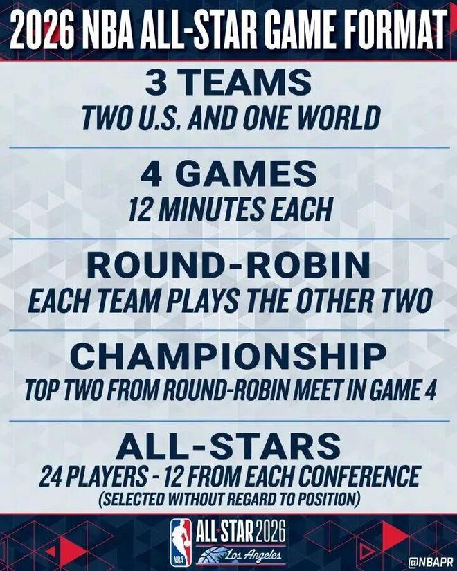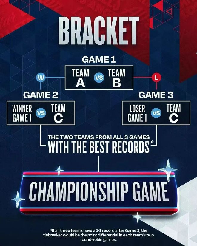 屆時(shí)兩支由美國球員組成的球隊(duì)(美國隊(duì))和一支由國際球員組成的球隊(duì)(世界隊(duì))將以循環(huán)賽制進(jìn)行競(jìng)爭(zhēng),共包括四場(chǎng) 12 分鐘的比賽。這三支球隊(duì)每隊(duì)至少將有八名球員。